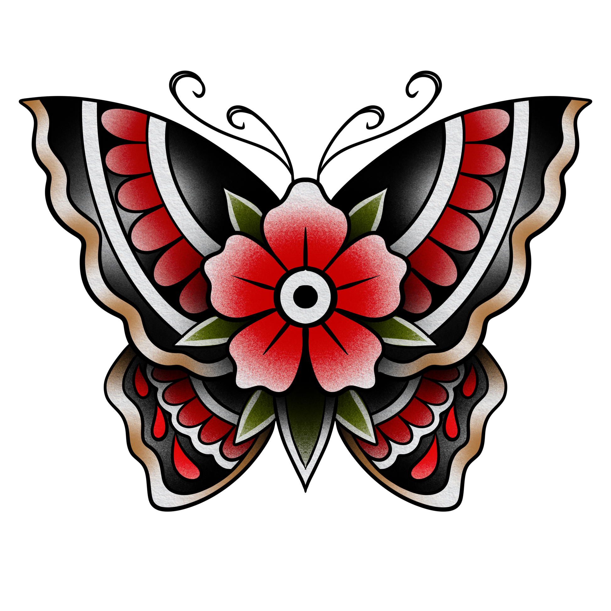 Bold American Traditional butterfly—crisp scalloped wings framing a classic flower medallion—rich blends, clean lines, built to pop.