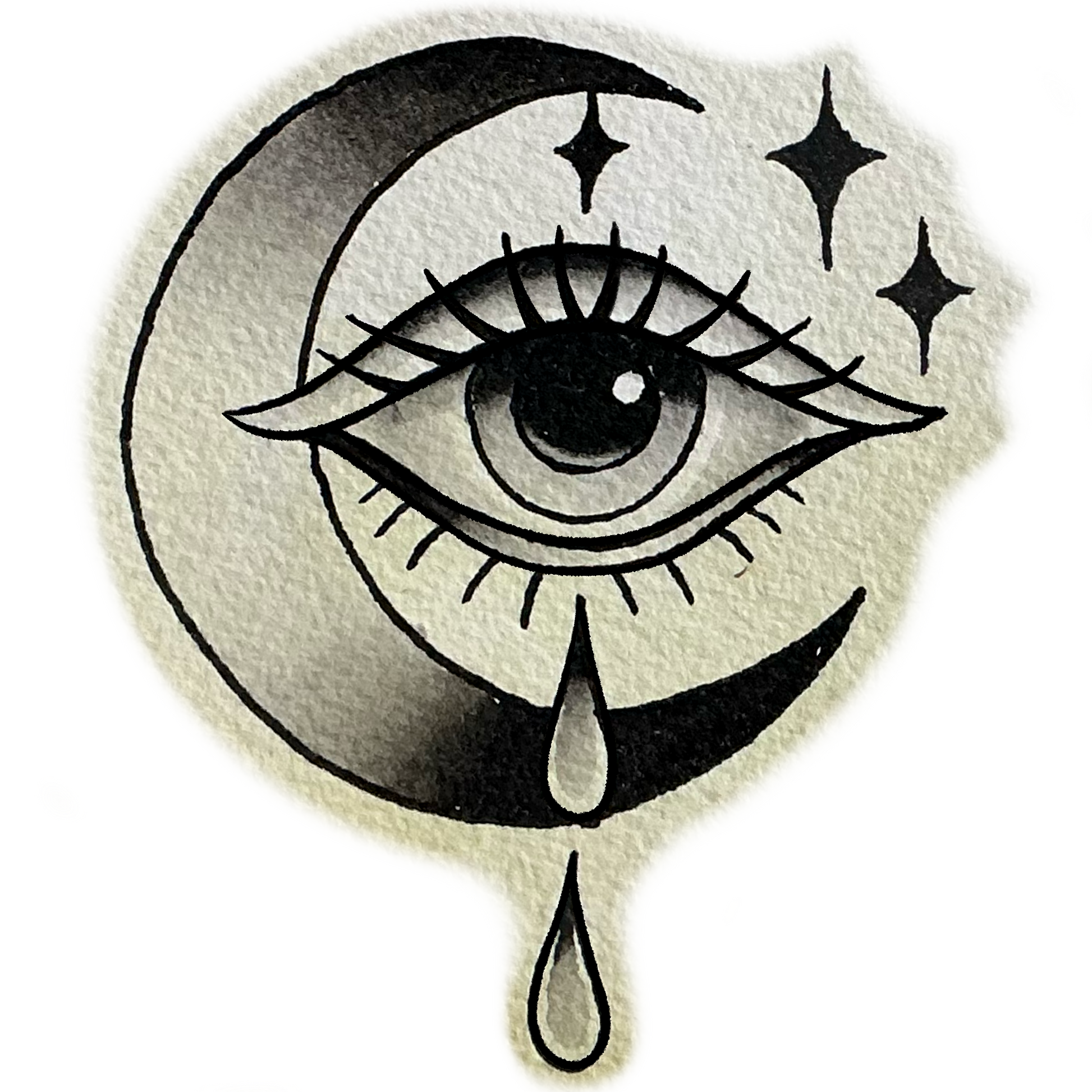 Hand-painted black & gray eye cradled by a crescent moon, with a single long tear and star accents. Soft, witchy flash from the Second Sight collection.