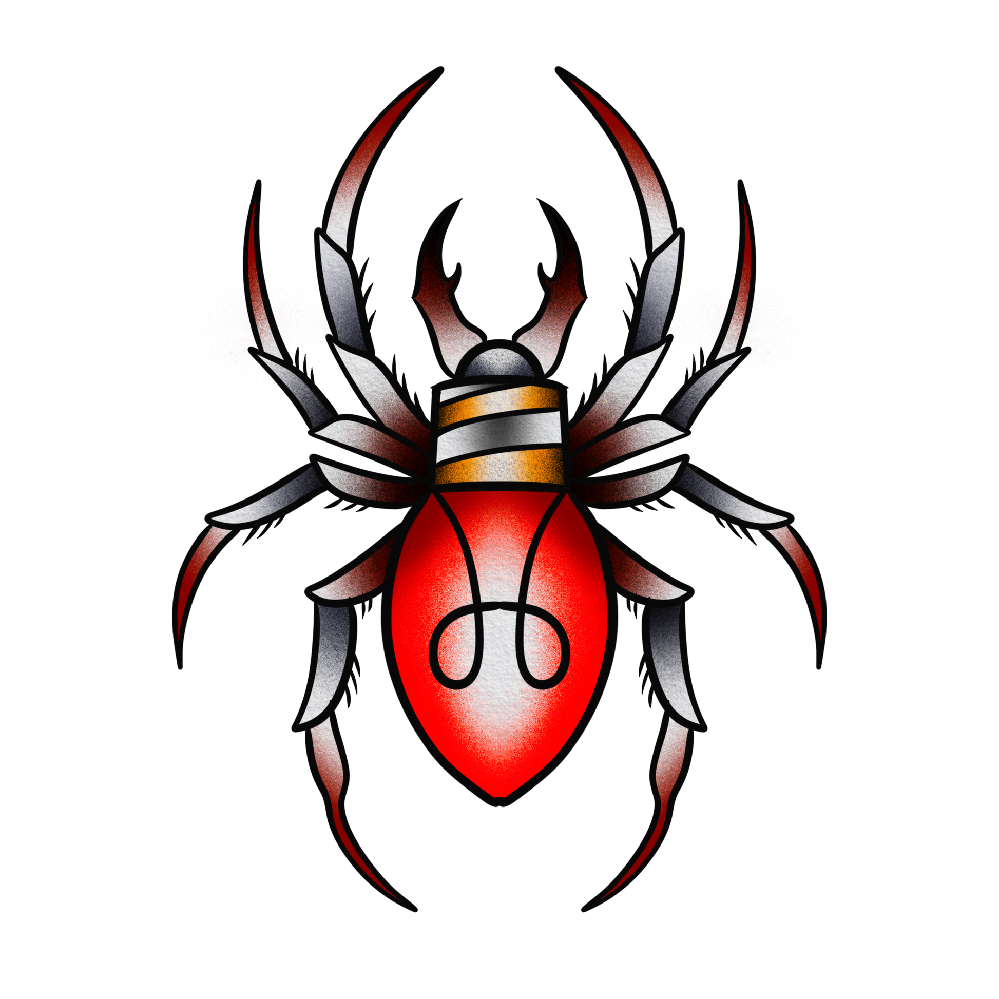 Bold neo-traditional spider — armored legs and horned head wrapped around a glowing holiday bulb.