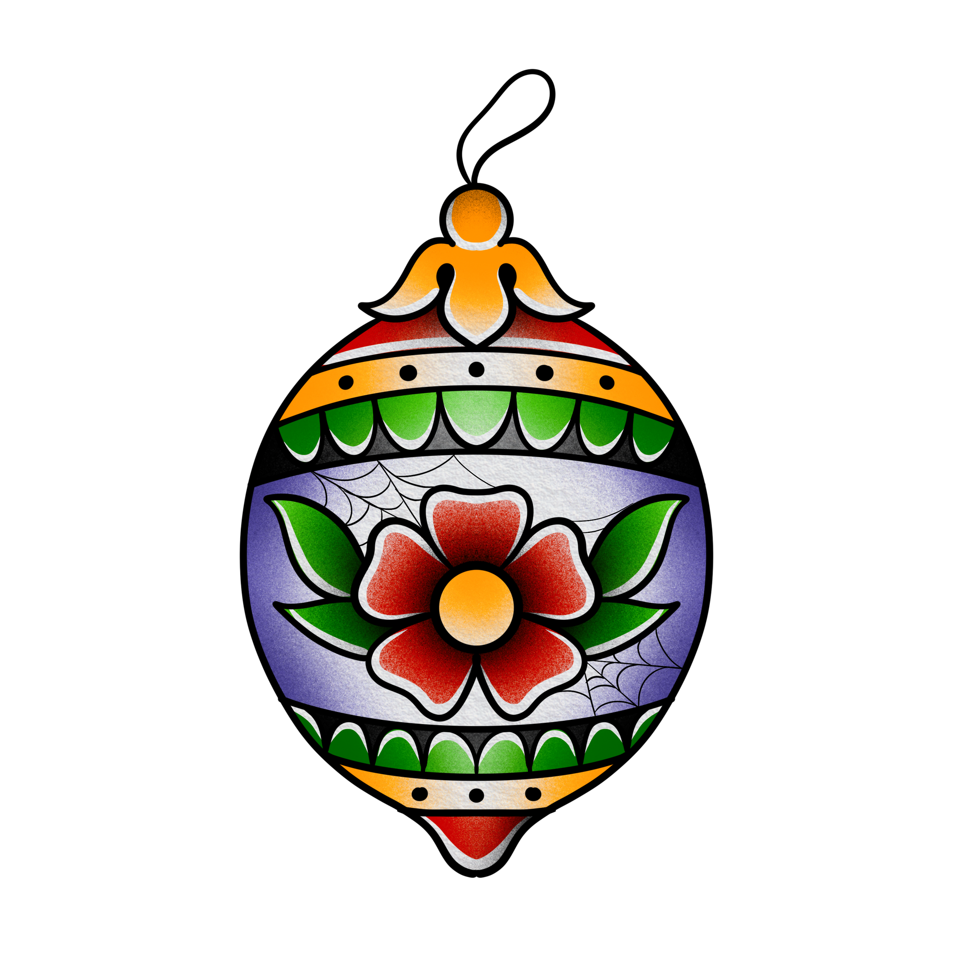 Bold traditional glass ornament — scalloped bands, spider-web lace, and a rosy medallion center.